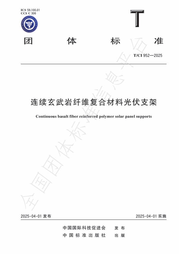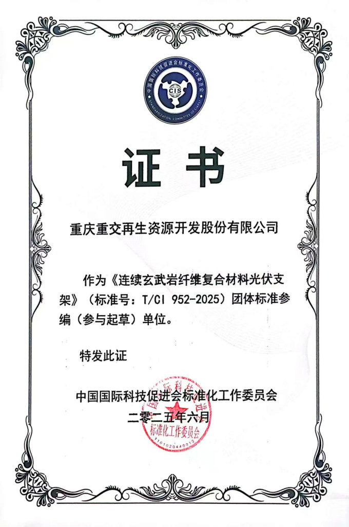 近日,由中國國際科技促進會發布的團體標準《連續玄武巖纖維復合材料光伏支架》(T/CI 952-2025)正式實施。重慶重交再生資源開發股份有限公司作為重要參編單位之一,深度參與了該標準的起草與制定工作。