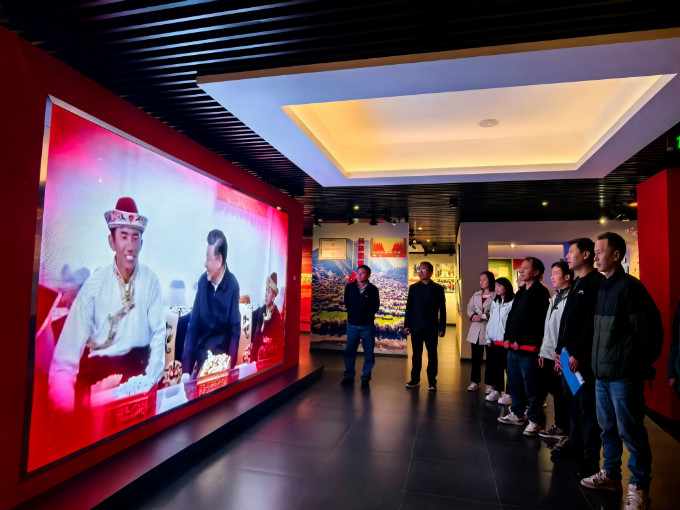 活動中,大家觀摩了嘎拉村“團結頌”主題教育展覽館。展覽館以“團結頌、振興頌、英雄頌、解放頌”四大主題展區,通過一幅幅歷史照片和詳實的發展歷程展示,生動呈現了嘎拉村在黨的堅強領導下,各族群眾團結奮斗,實現美麗鄉村建設的巨大變化。同時,黨支部依托展覽館黨員初心學堂電子平臺,開展黨建知識競賽,黨支部書記喬次仁圍繞總書記重要回信精神講黨課。